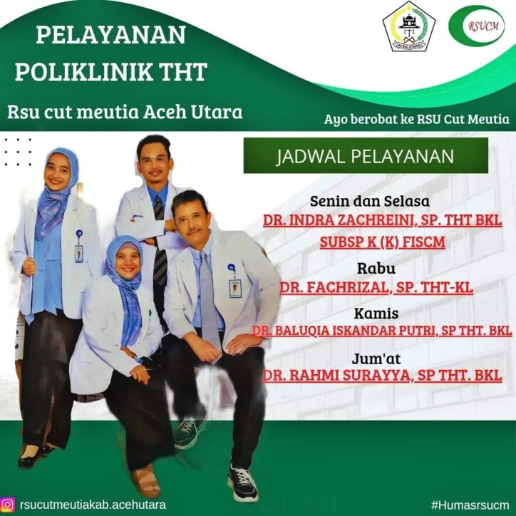 Poliklinik THT RSUD Cut Meutia didukung oleh tenaga medis berpengalaman dan fasilitas modern yang memadai, menjadikannya pilihan utama bagi pasien yang membutuhkan penanganan spesialis. Plt Direktur Zulfitri, saat ditemui di ruang kerjanya, menegaskan bahwa rumah sakit terus berupaya memberikan pelayanan berkualitas dengan jadwal dokter spesialis yang teratur. “Kami berkomitmen memastikan masyarakat mendapatkan layanan yang mudah diakses, nyaman, dan berstandar tinggi,” ujarnya.